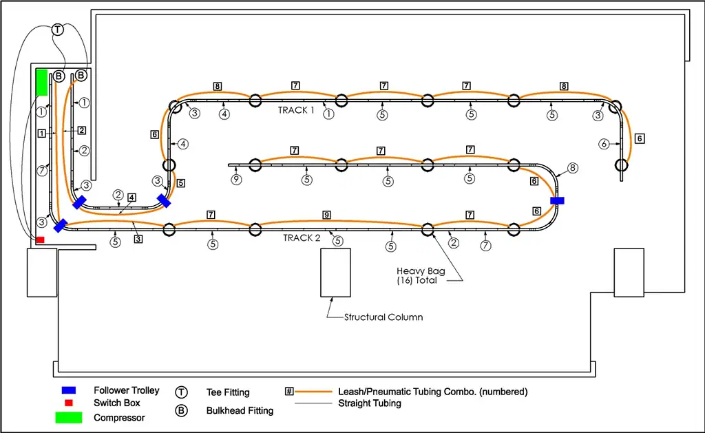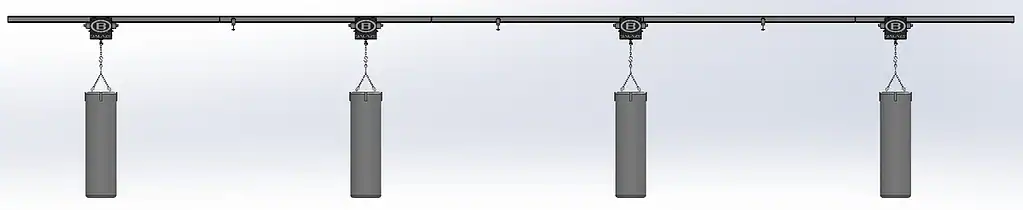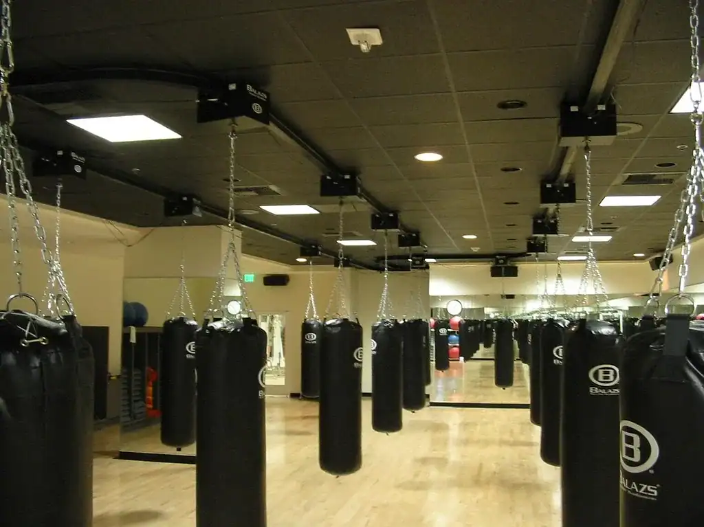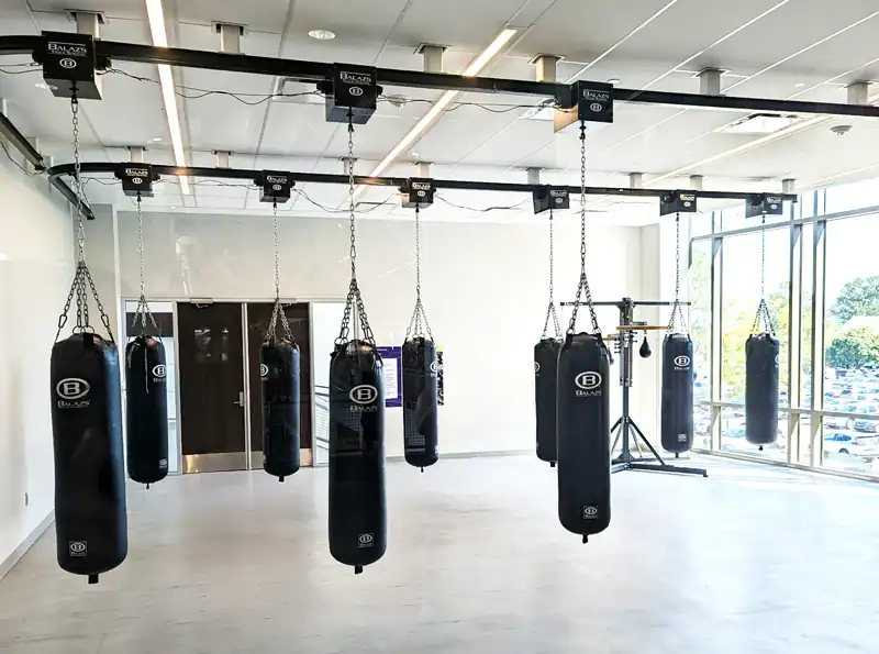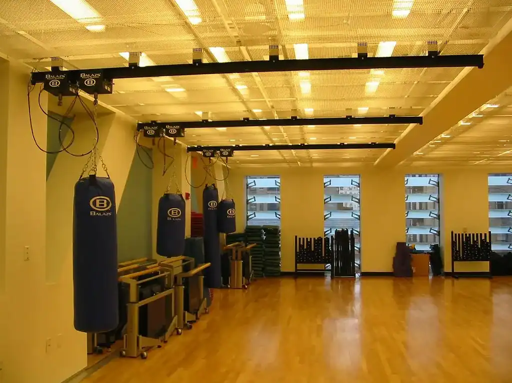 Design the layout of the track to meet your facility’s needs. The ceiling-mounted tracks can bend around corners and extend into closets to hide bags when not in use. Whether you are deploying one bag or a whole room full, the Balazs® Ultra-Track® System provides the ultimate solution for boxing bag set-up. Balazs® Ultra-Track® can be seen in Golds Gyms, JCCs (Kansas City, San Francisco, Manhattan), Krav Maga, Montclair U, LSU, Oklahoma State, City of Phoenix, Phoenix Police Dept, Towson State, U Penn, YMCAs, Colorado State, Healthworks Boston, SCC Beverly Hills, Texas A&M, etc.
